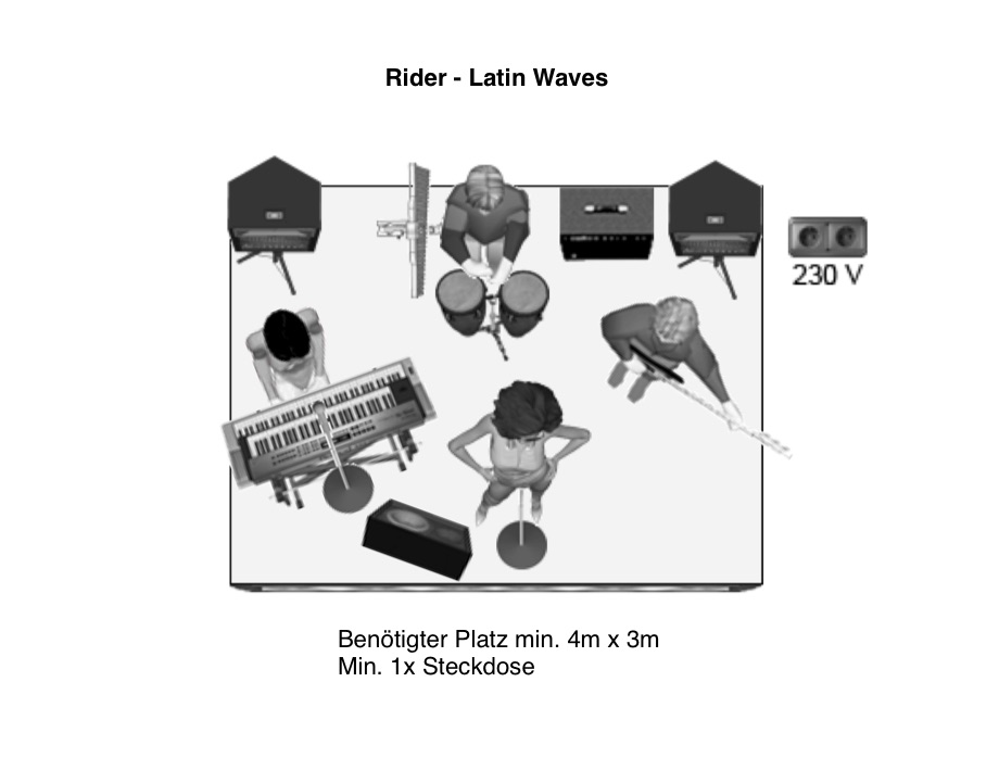 Mit einem Platzbedarf von nur 4×3 Metern gehören Endrina’s Latin Waves zu unseren größeren Hochzeitsbands. Ideal für Locations wo es auch eine Bühne oder die Möglicheit für einen Tanzbereich gibt.